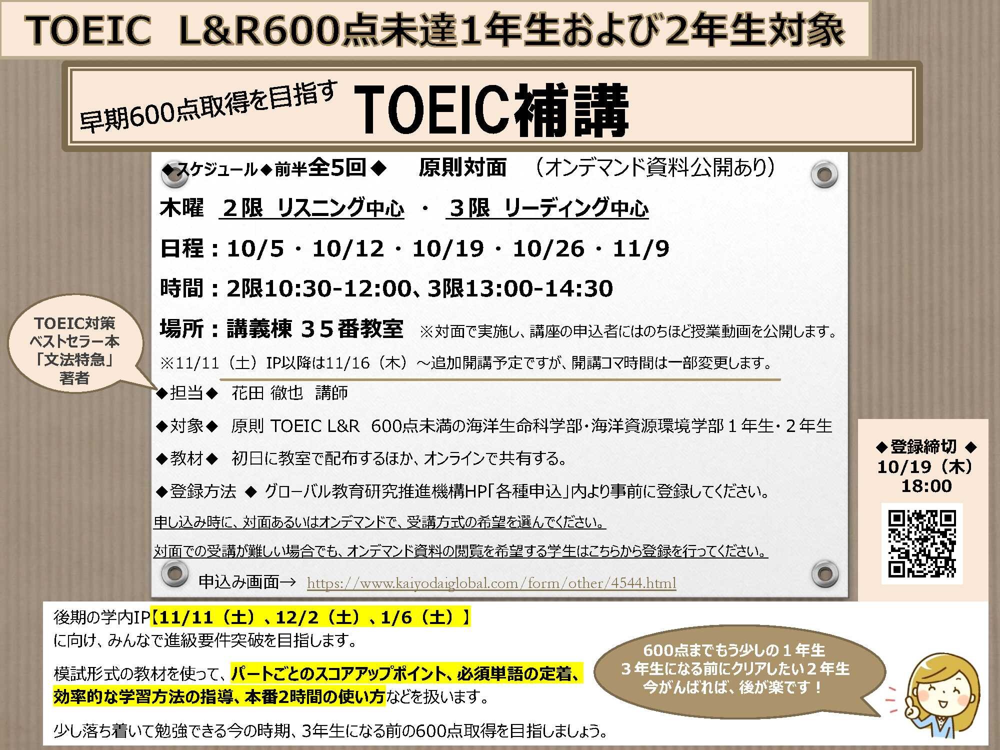 2023年度TOEIC補講(前半)について ※TOEIC600点未満の海洋生命科学部・海洋資源環境学部の1~2年生 対象※ 掲示等でお知らせしております「TOEIC補講」を行います。 以下のURLフォームから登録してください。 2023年度TOEIC補講(前半)について フォームの状態を確認しています... 申込み期間は終了いたしました。 問い合わせ先 東京海洋大学 国際・教学支援課 管理係電話:03-5463-0636 Email:ks-kanri@o.kaiyodai.ac.jp HOME > 各種申込み一覧 > 各種申込み > 2023年度TOEIC補講(前半)について