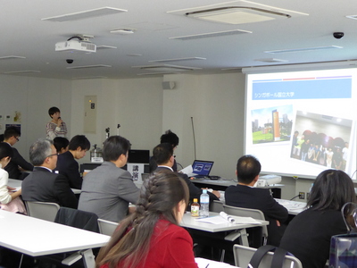 グローバル人材育成推進事業に係るプレゼンテーションとして、小松特任教授による「世界に羽ばたくグローバル人材育成プログラム~「海外探検隊」の取組」に続いて、2014年8月に海外探検隊3期生としてシンガポールに派遣された、政策文化学科2年の佐藤春奈さんによるシンガポール探検隊のプレゼンが行われました。現地のシンガポール国立大学プロジェクトであるサンゴ礁の生態調査や、JSTプロジェクトであるシンガポールでの科学分野における女性の活躍についての調査が紹介されました。