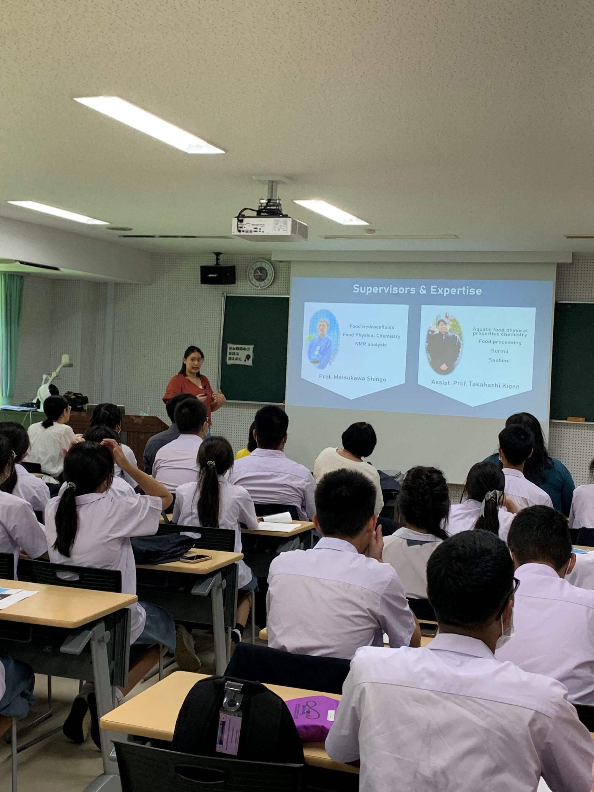 また、博士後期課程のタイ留学生による研究および日本での留学生活が紹介され、学生たちは留学に向けての具体的なモデルケースに触れ、Q&Aセッションでは積極的なやり取りが行われていました。その後のラボツアーでは研究室の学生による説明に熱心に耳を傾けていました。