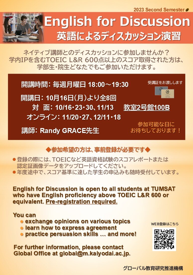 掲示等でお知らせしております『英語によるディスカッション演習』を受講希望の方は、以下のURLフォームからお申込みください。